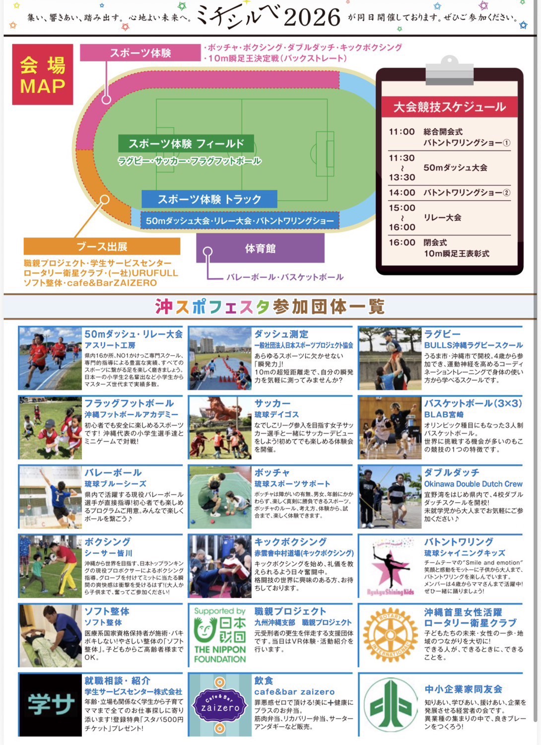 沖縄県の健康寿命が短くなっている現状をふまえ、スポーツを通して楽しく健康な体作りをする機会を提供して健康に対する意識を高めることを目的に、賛同いただく様々な競技団体の皆様とイベントを盛り上げてまいります。また、沖縄国際大学で開催される「ミチシルベ2026」との協力開催事業になります。